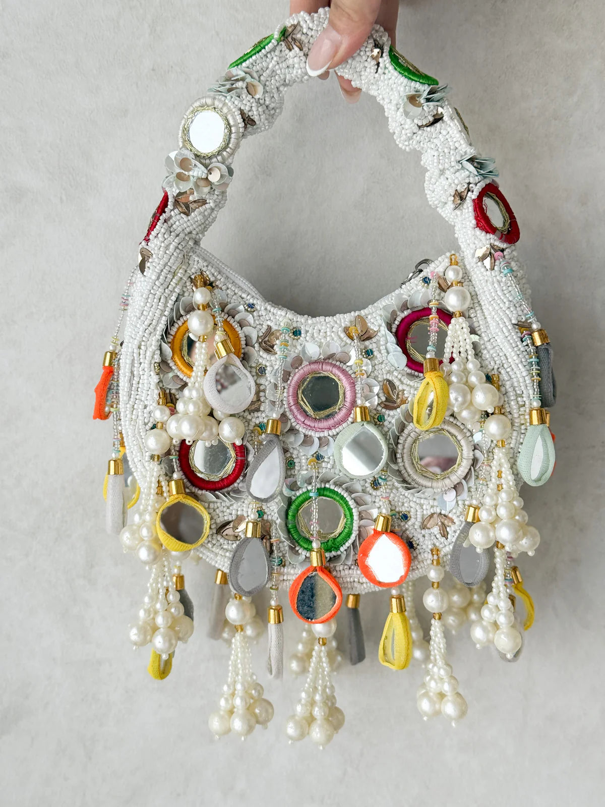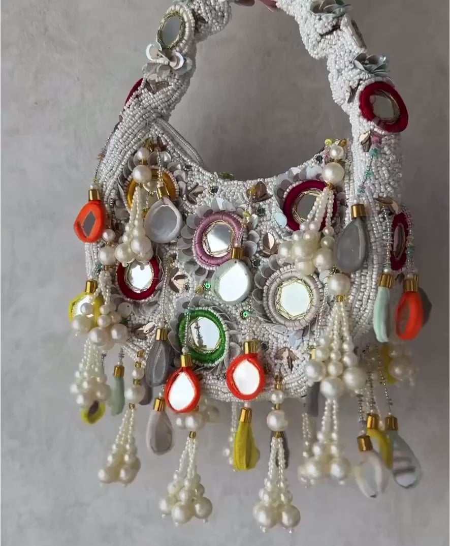 The Joyful, vibrant, and intricately crafted, the WHITE Pearl Carnival Bag is a celebration of color and craftsmanship. Hand-beaded in bright multi-tones atop a pearl-white base, this bag features reflective mirror accents, soft fabric teardrop charms, and luxurious pearl clusters that dance as you move.