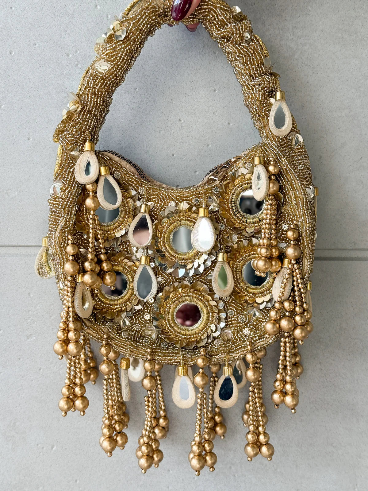 Step into the glow with the GOLD Golden Mirage Bag, a hand-embroidered statement piece dripping in luxe gold beading, mirrored accents, and cascading pearl-inspired droplets. Each detail is artisan-crafted — from the teardrop charms to the layered circular mirrors that shimmer with every movement.
