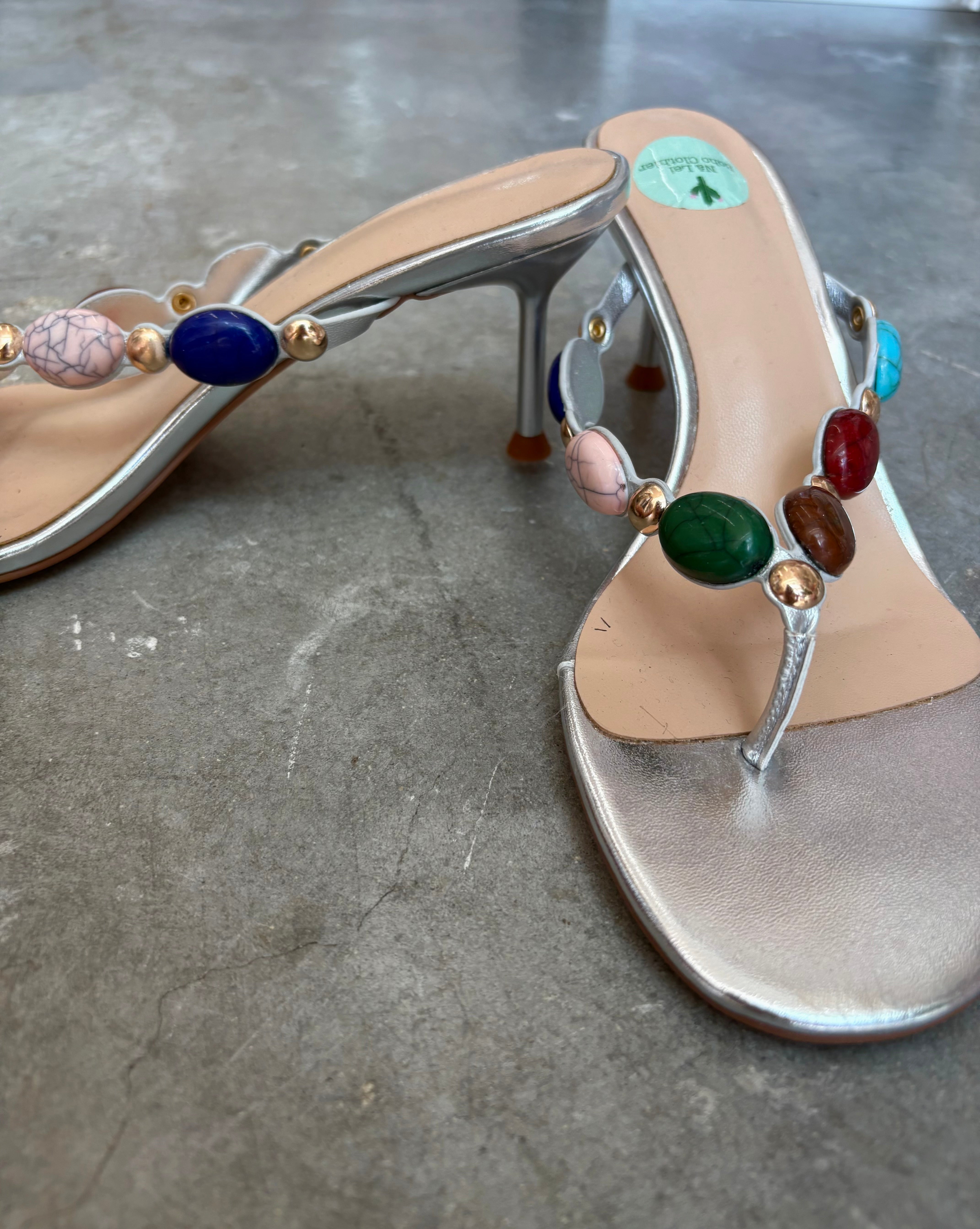 Step into the spotlight with the Carnival Gem Heels. Set on a sleek silver heel and adorned with jewel-toned stones, this playful yet elegant pair is made for dancing from golden hour to late-night festivities. Lightweight and vibrant, they bring a boho-luxe twist to any outfit — the perfect heel for summer soirées, island nights, and festive escapes.