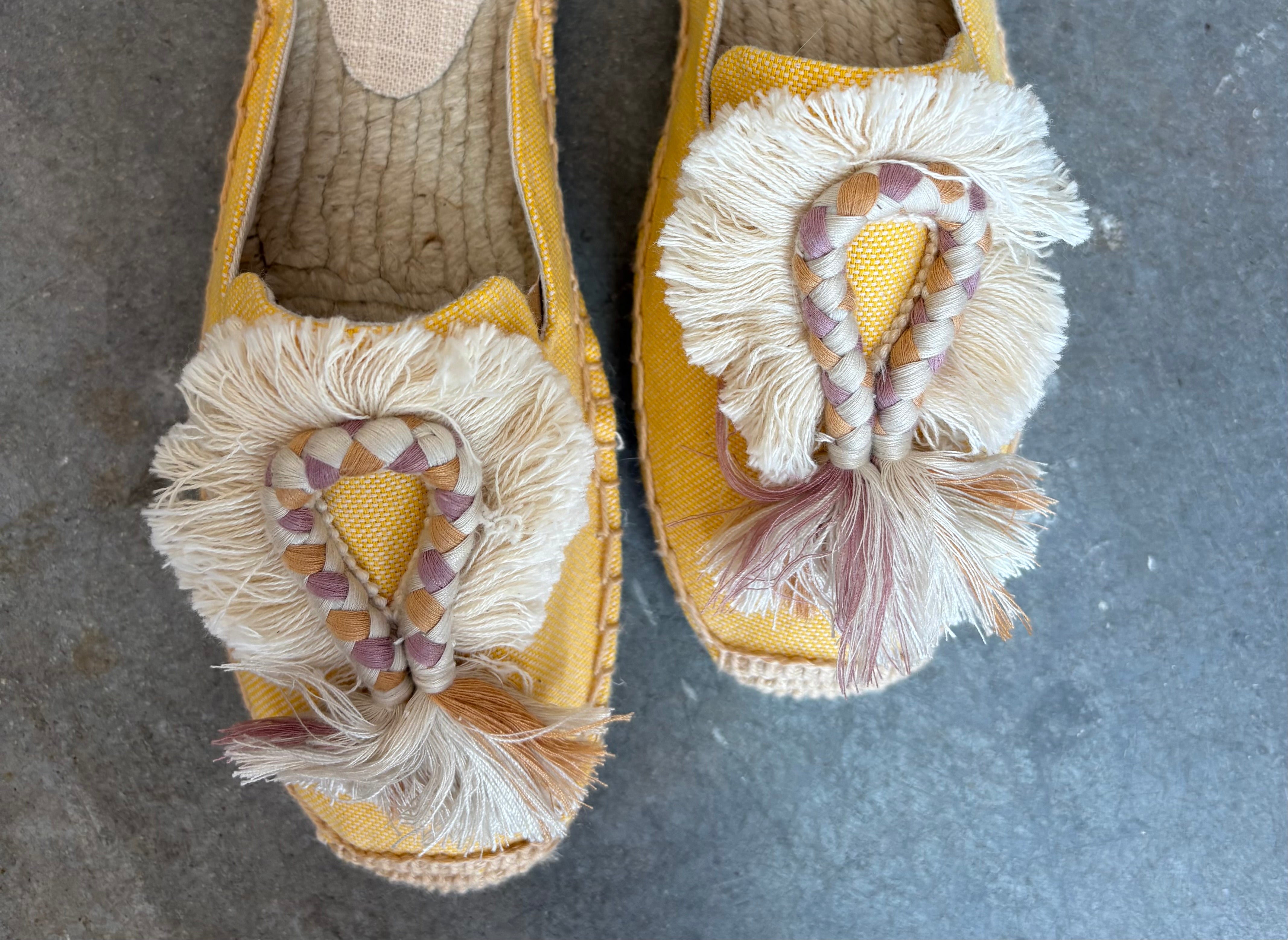 Step into sunshine with the Solstice Mules. Crafted with a natural woven sole, golden-yellow canvas, and playful braided tassel fringe, these mules embody effortless boho charm. Light, airy, and eye-catching, they’re made for sunlit strolls, summer gatherings, and resort escapes — the perfect pair to carry you from golden hour to starry nights.