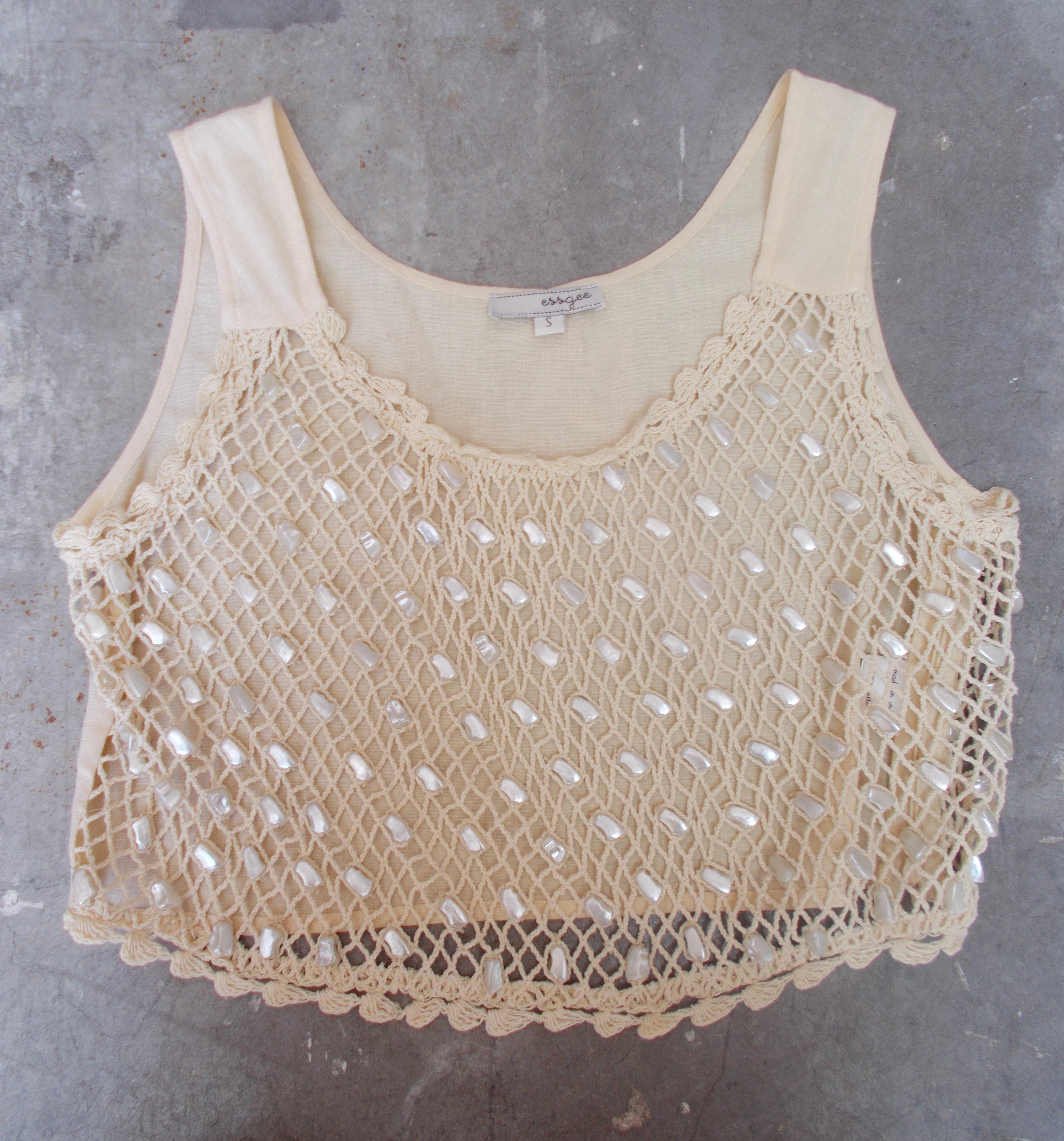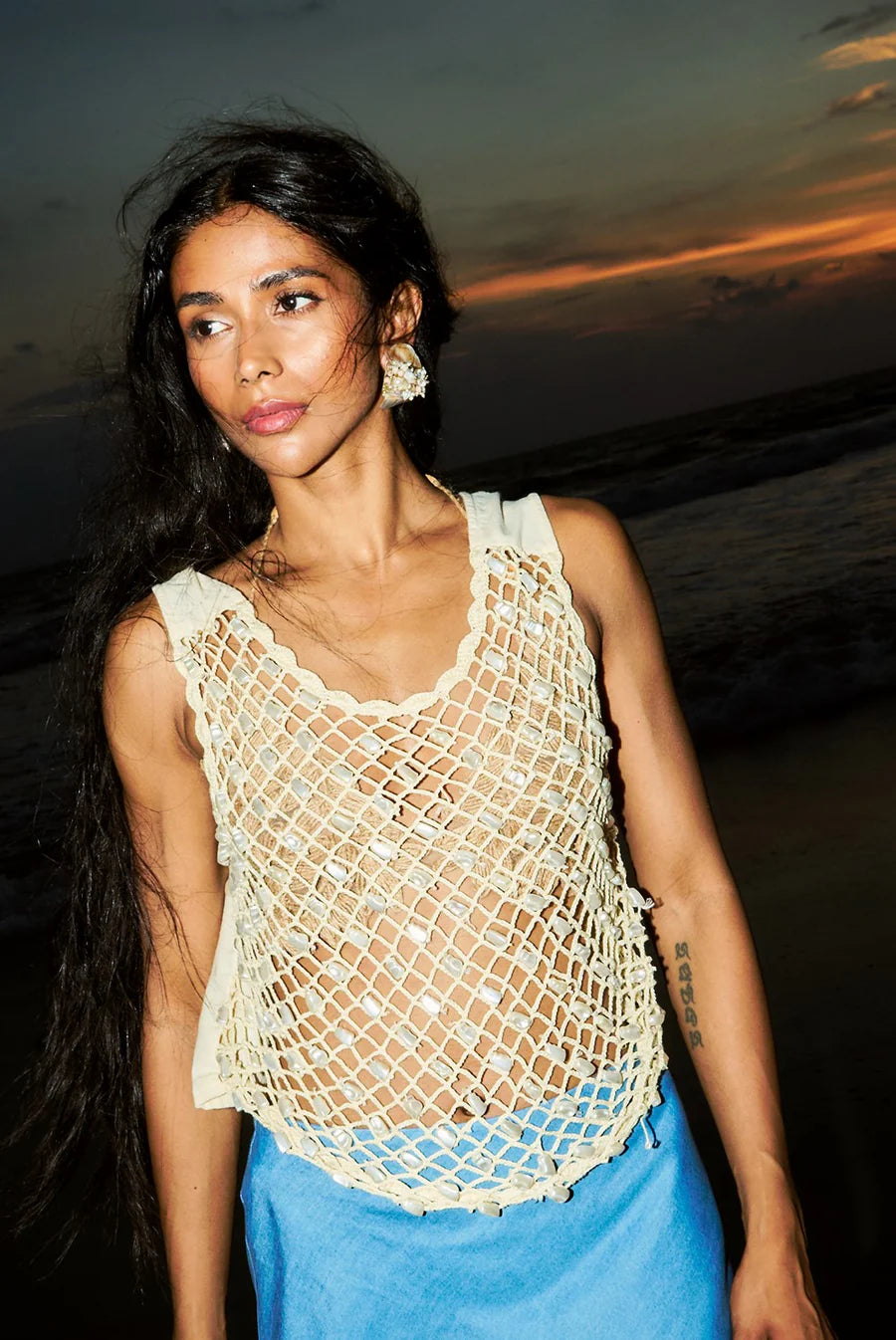 Handcrafted with breezy boho elegance, the Seashell Dreams Crochet Top is a delicate layering piece that instantly transports you to sunlit shores. Featuring a soft neutral base topped with an intricate crochet net adorned with pearl-like beads, this cropped tank is all about laid-back luxury. Pair it with flowy skirts, high-waisted denim, or over your favorite bikini for a beach-to-bungalow look.