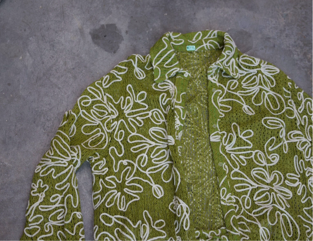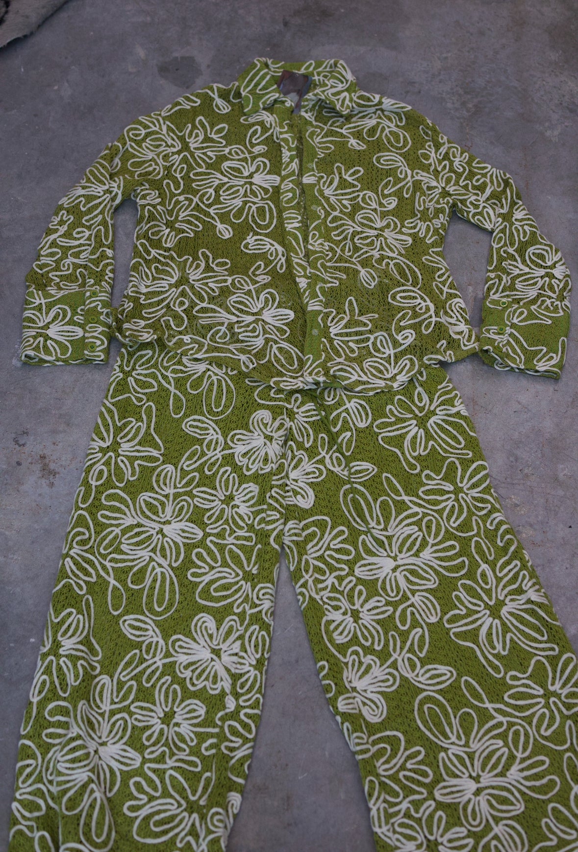 The Palm Bloom Two-Piece Set pairs a breezy button-down with relaxed-fit pants, both in a fresh green lace embroidered with playful white florals. Lightweight and effortlessly chic, this matching set is perfect for sunny brunches, coastal getaways, or making an easy statement from day to night. Wear together for a coordinated look or mix and match with your wardrobe favorites.
