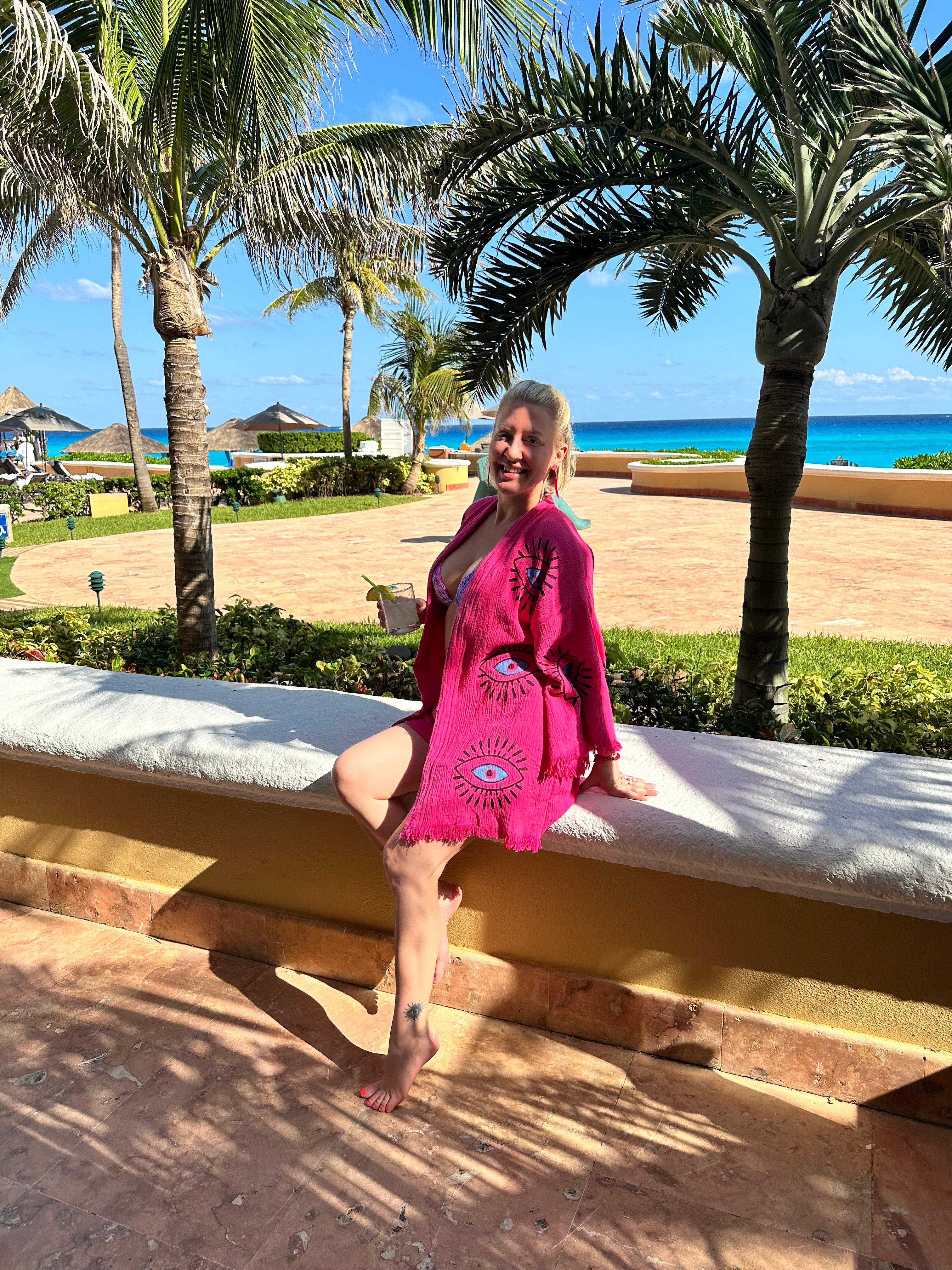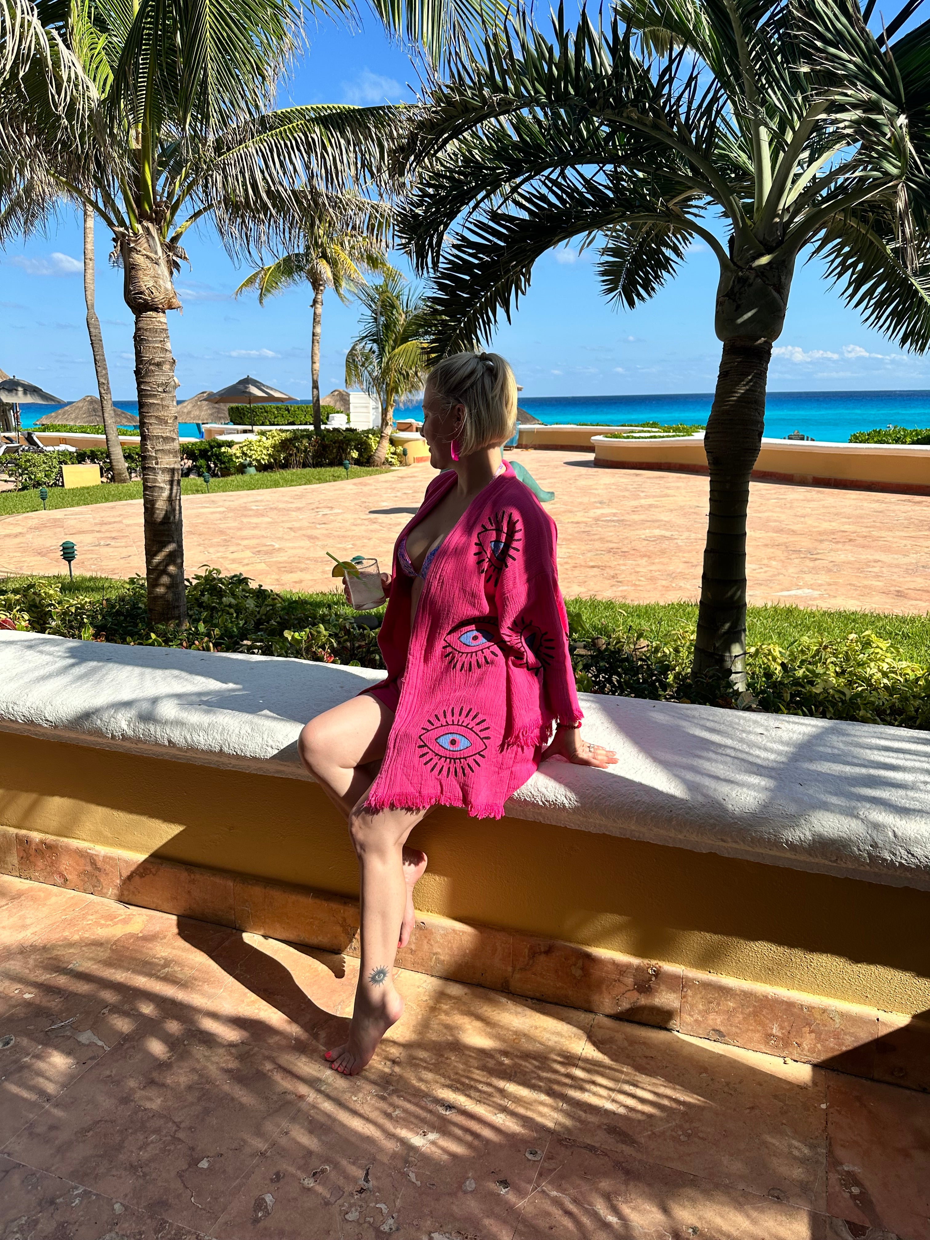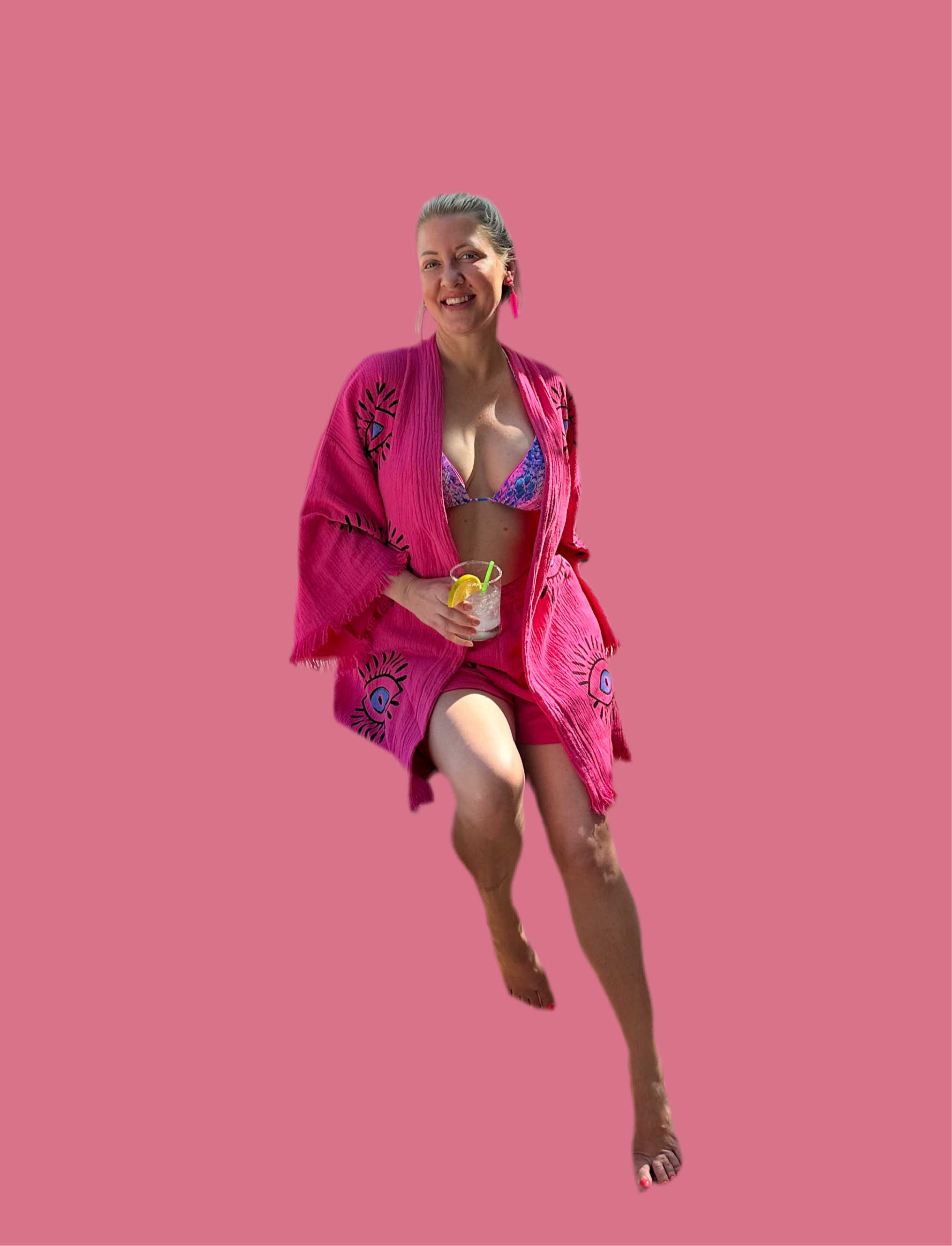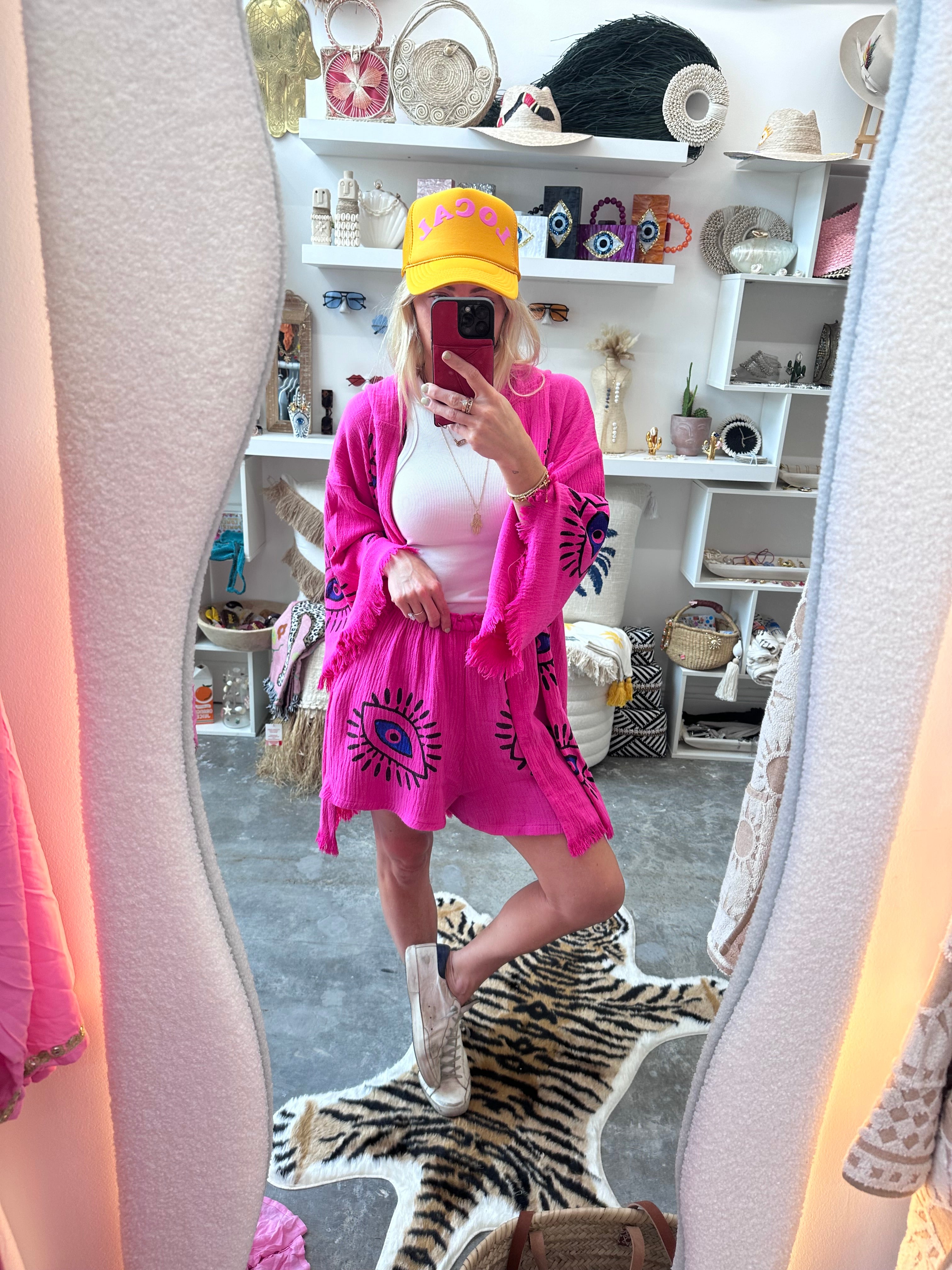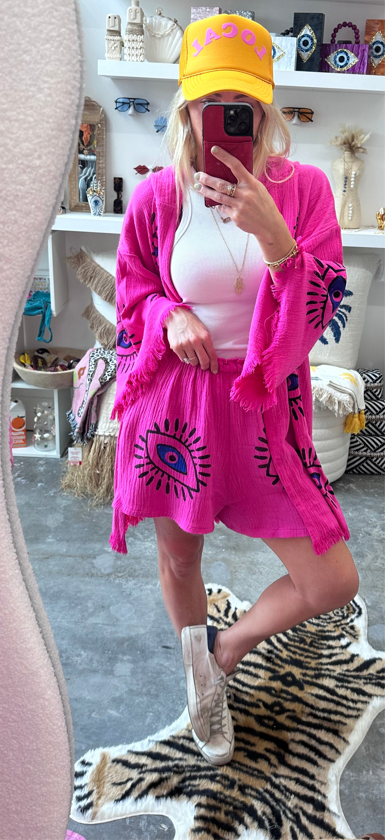 Vibrant, eye-catching, and full of attitude—this hot pink kimono and shorts set is handcrafted from raw organic cotton and handpainted in Turkey. Adorned with bold evil eye motifs for a playful pop of protection, the robe features a cozy hood and belt, while the shorts offer a comfy elastic waist. Wear together for a statement look or mix and match with your favorite basics. Pure fun, no bad vibes.