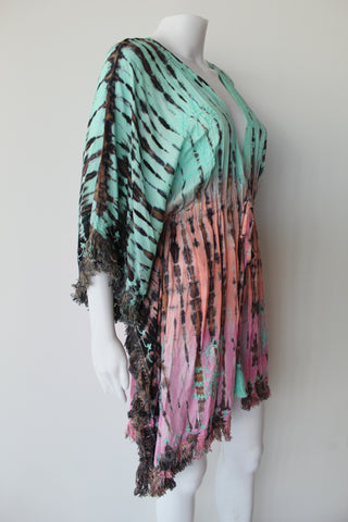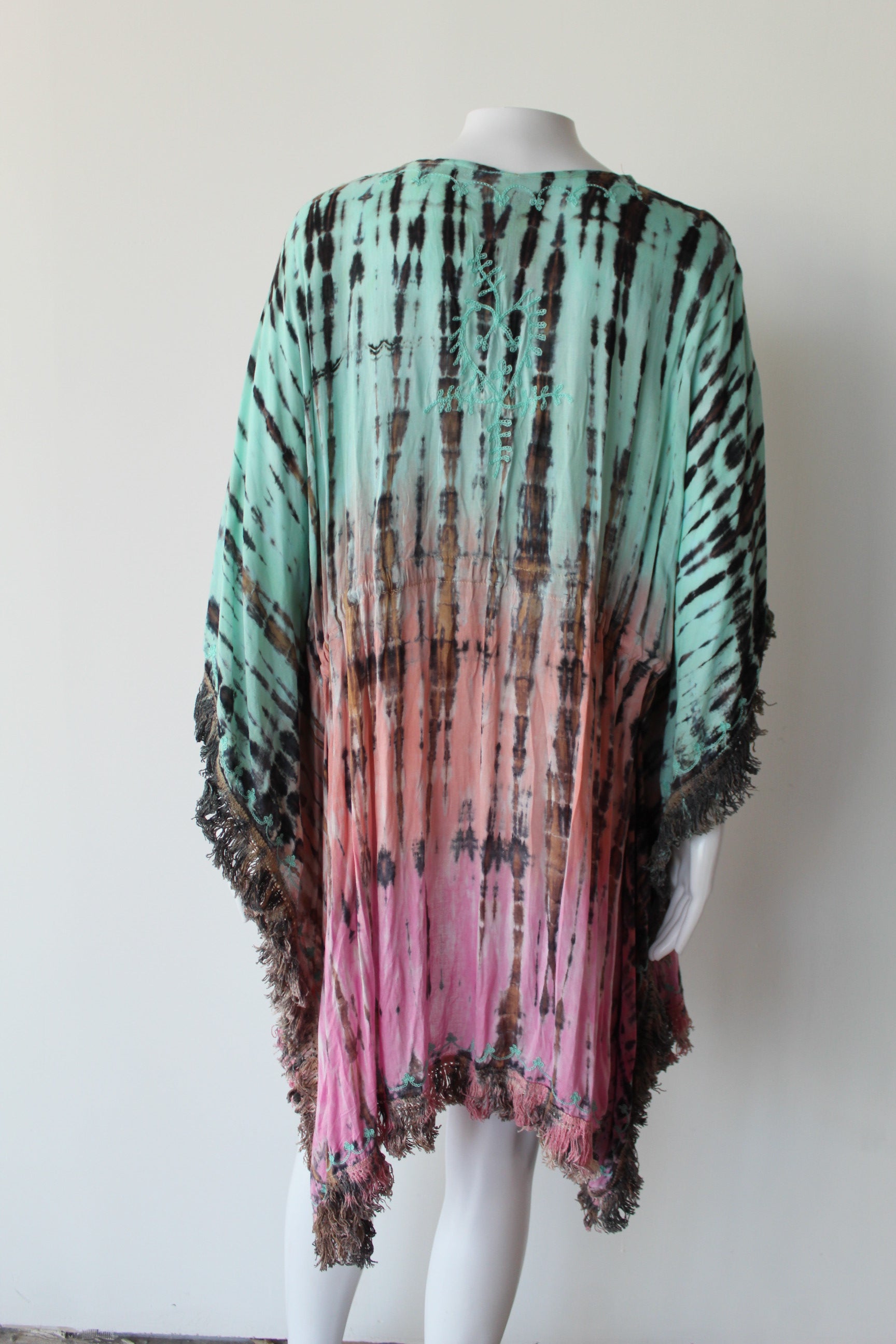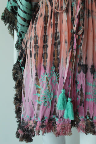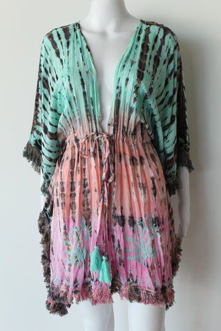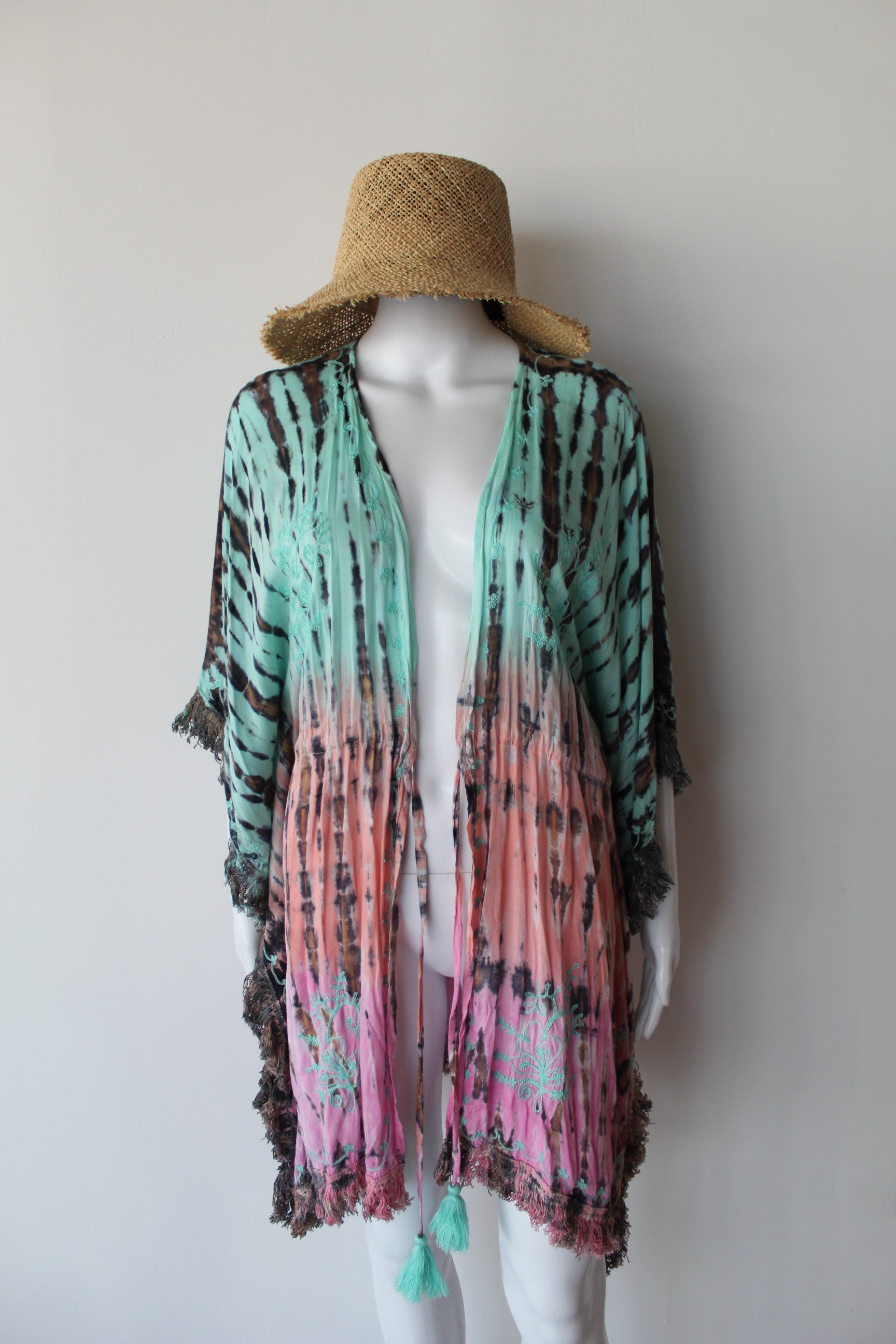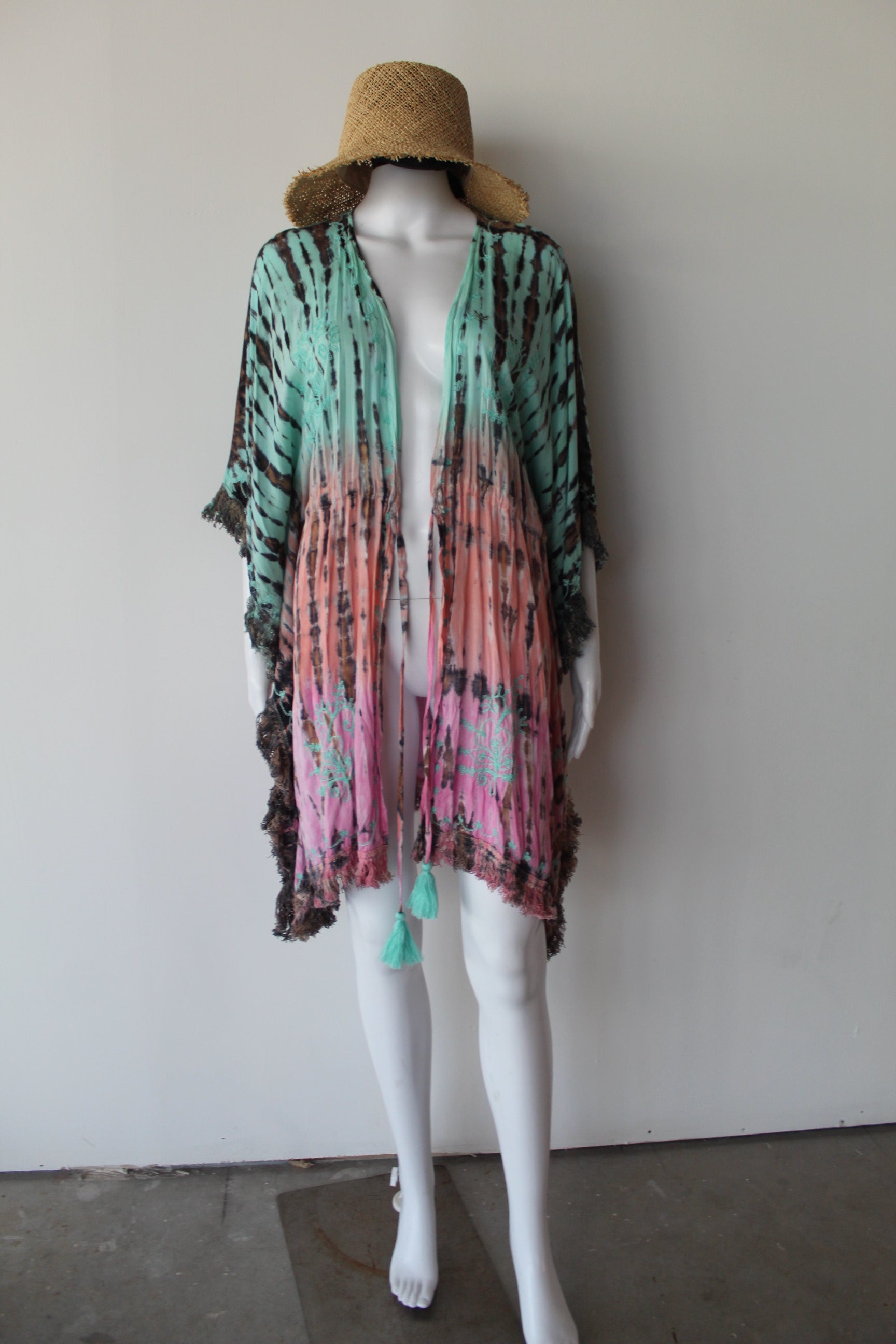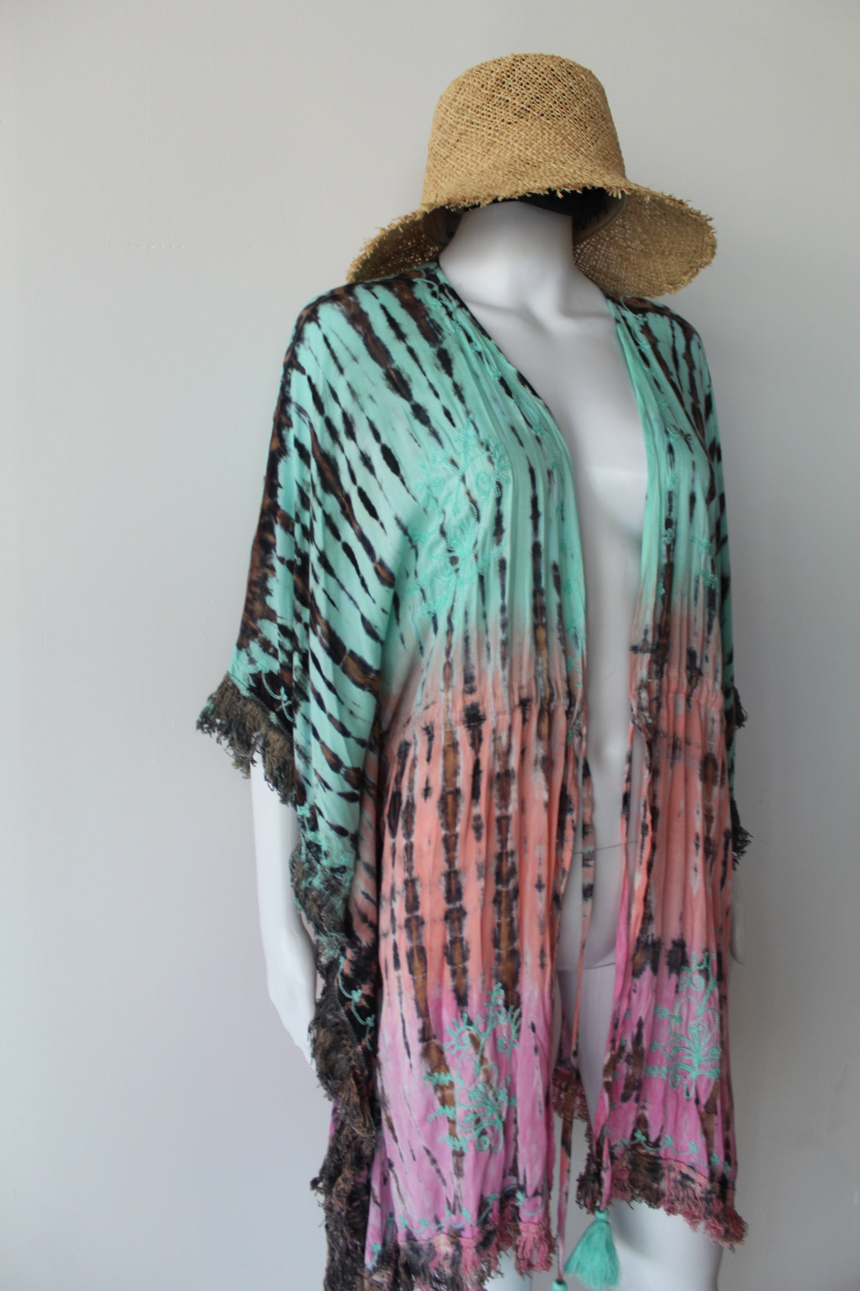 Bring the island glow wherever you go. This lightweight mini kimono is made from silky eco-conscious rayon and hand-dyed in dreamy sunset tones of aqua, peach, and pink. Embroidered details and soft fringe trim add a luxe touch, while tassel ties let you wear it open or cinched. Perfect for beach days, resort nights, or layering with ease.