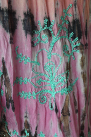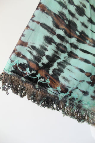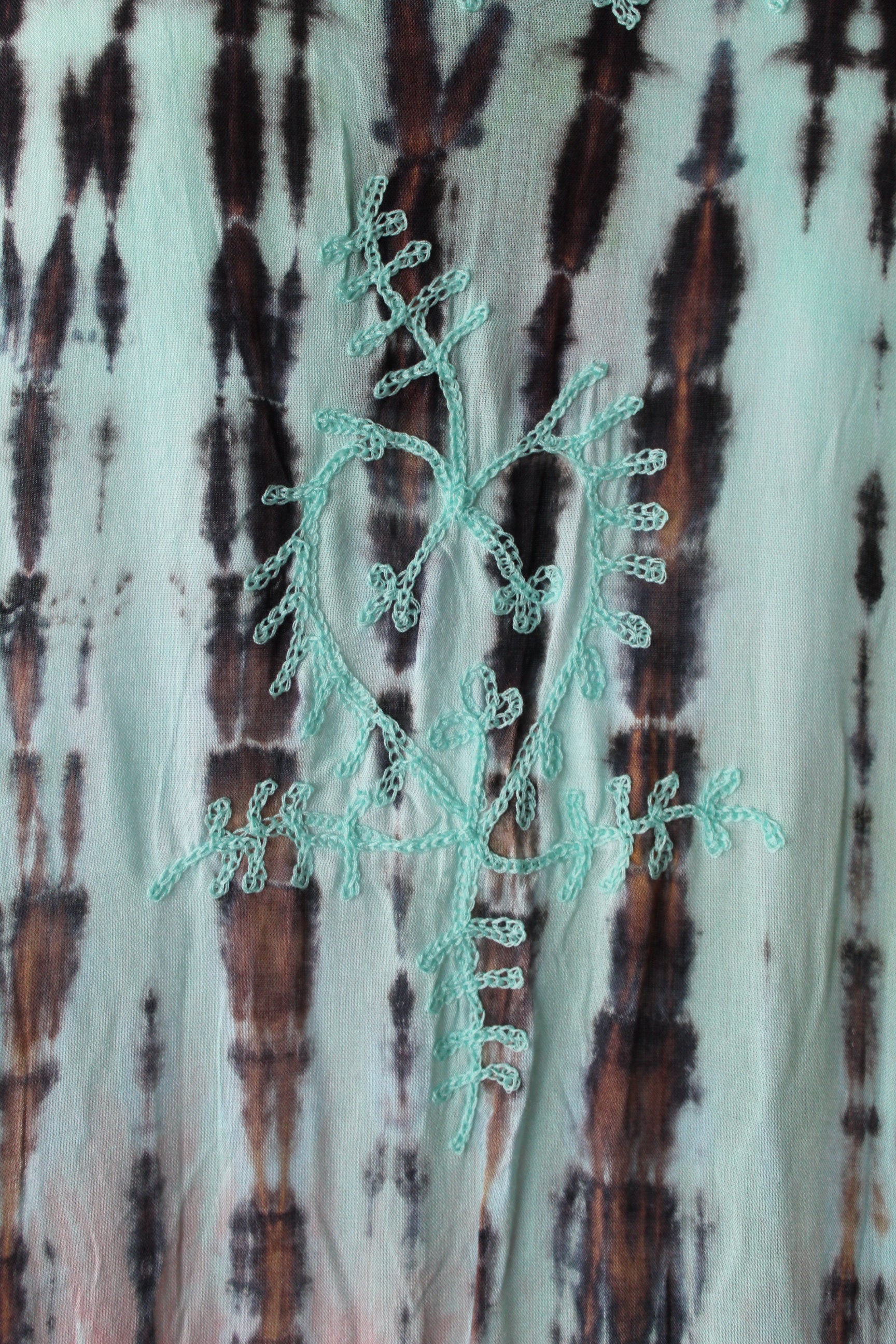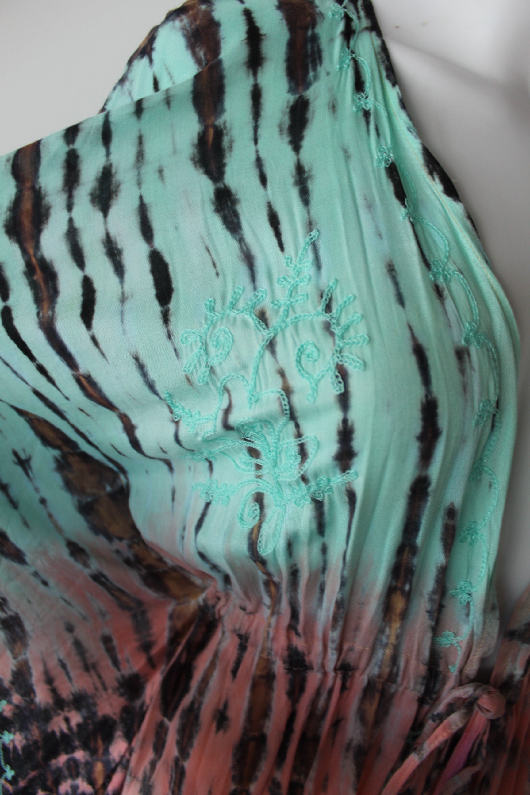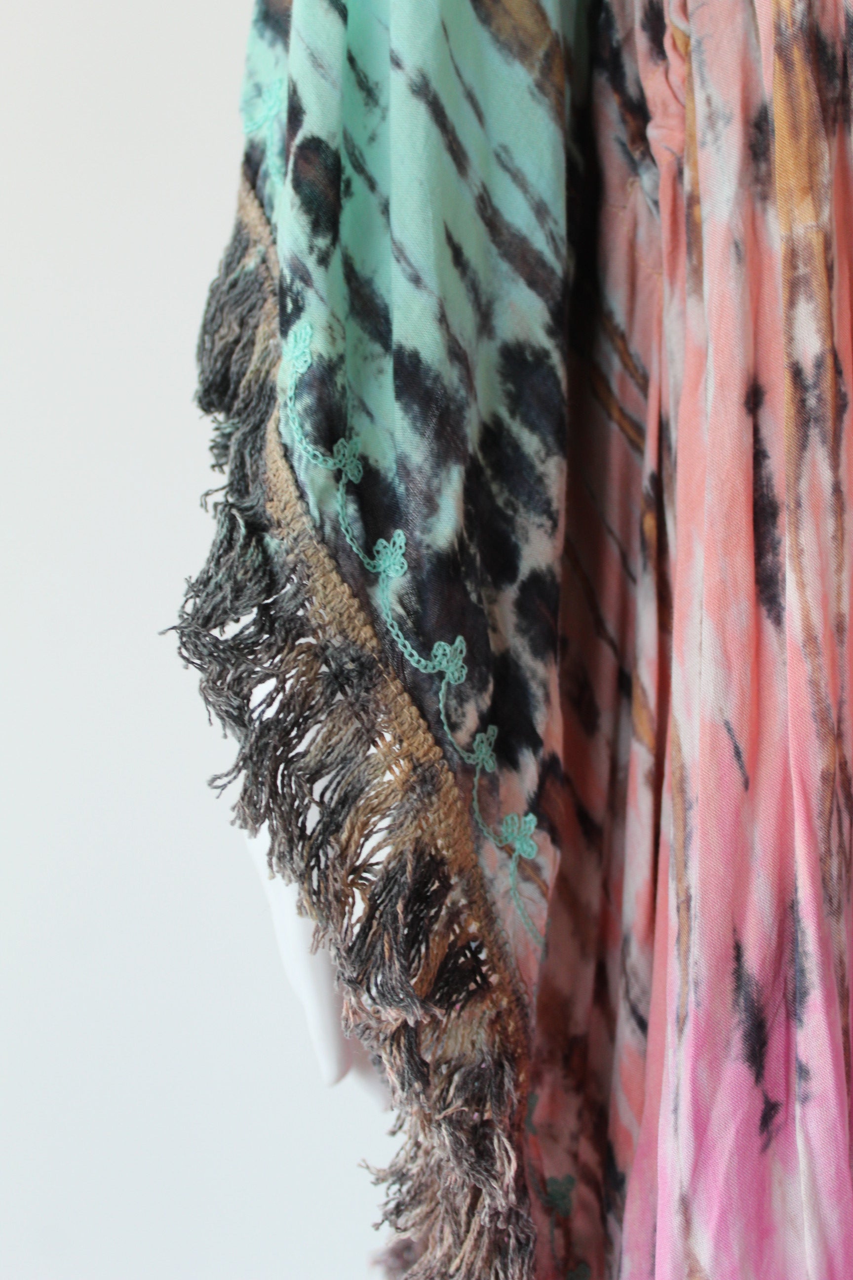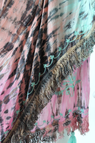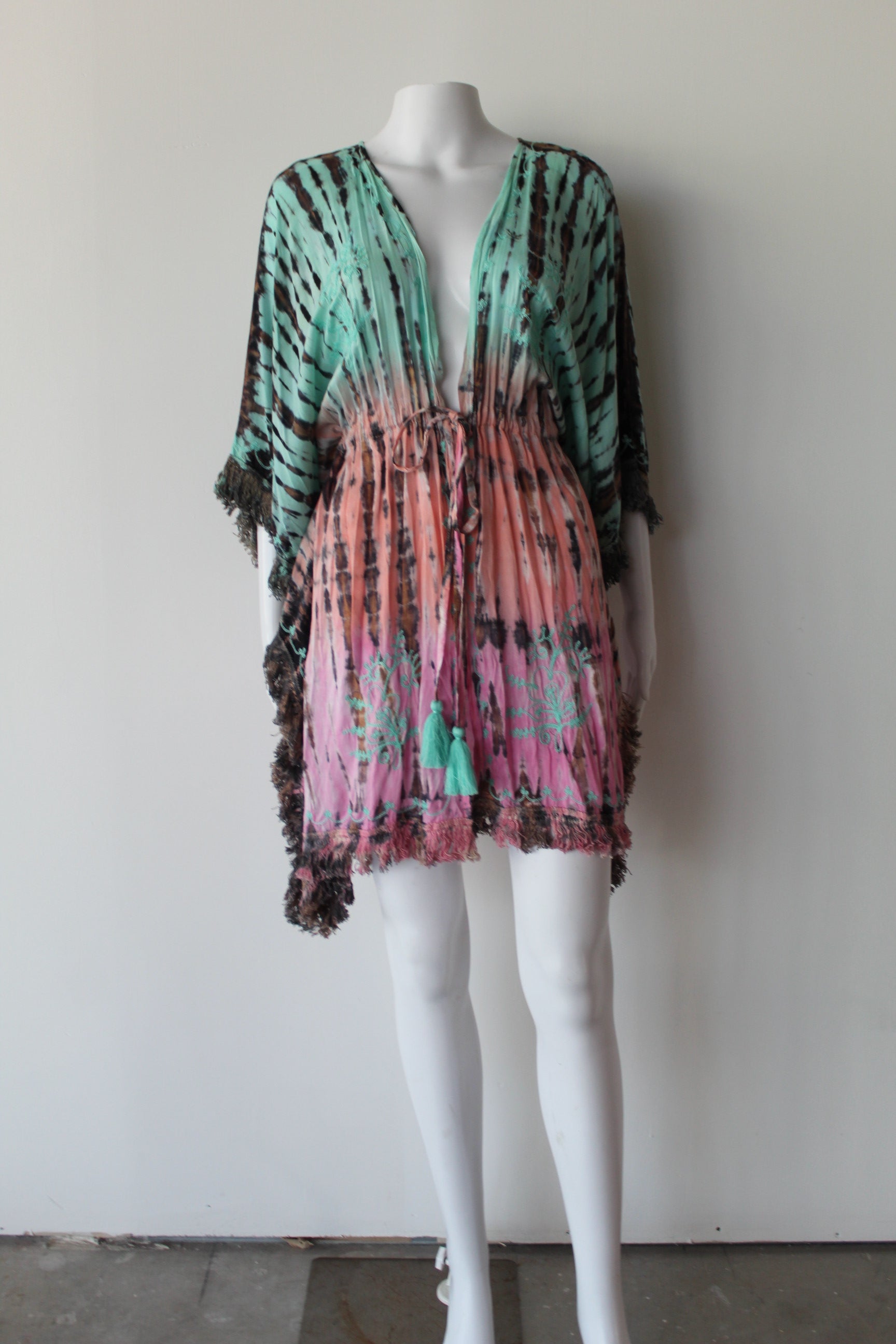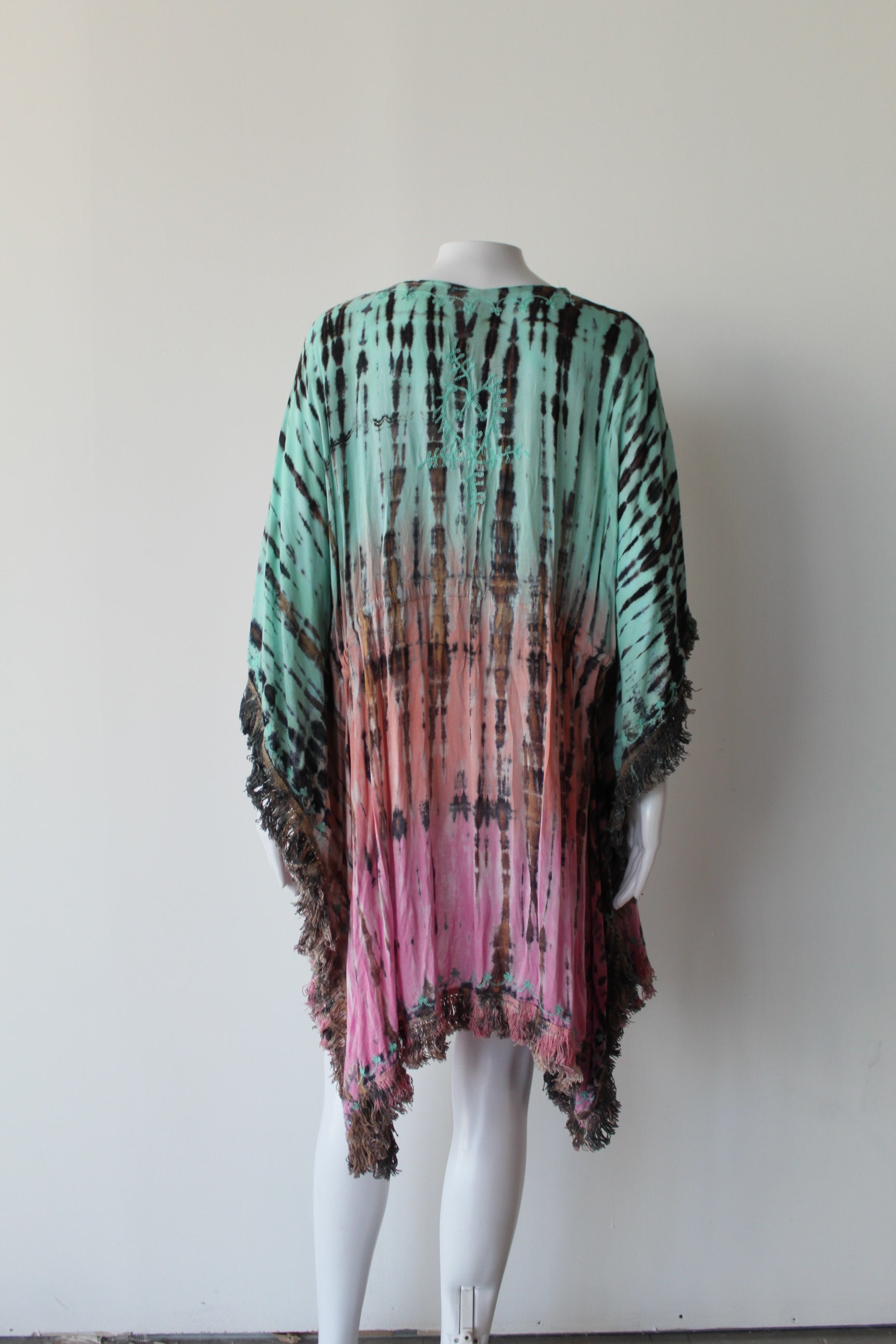 Bring the island glow wherever you go. This lightweight mini kimono is made from silky eco-conscious rayon and hand-dyed in dreamy sunset tones of aqua, peach, and pink. Embroidered details and soft fringe trim add a luxe touch, while tassel ties let you wear it open or cinched. Perfect for beach days, resort nights, or layering with ease.